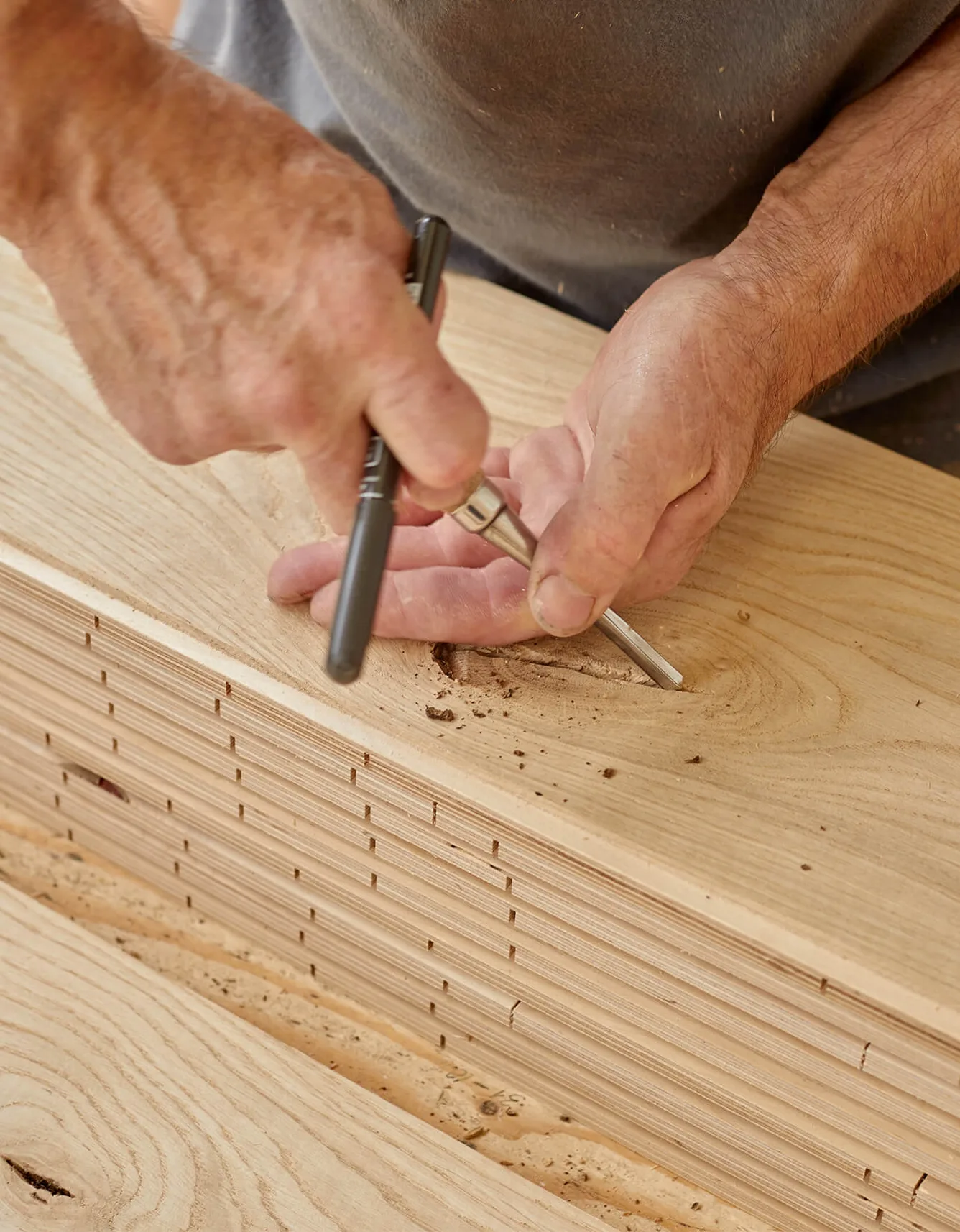 Our technical facilities rank among Europe’s best. We bond floors using reactive HotMelt technology for highly durable, long-lasting joints. Knots and cracks are precisely filled by a CNC line with natural Swiss filler. The surface is then machined with diamond tools and finished with natural oils. Final character comes from the hands of our craftsmen through planing and hand-finished edges.