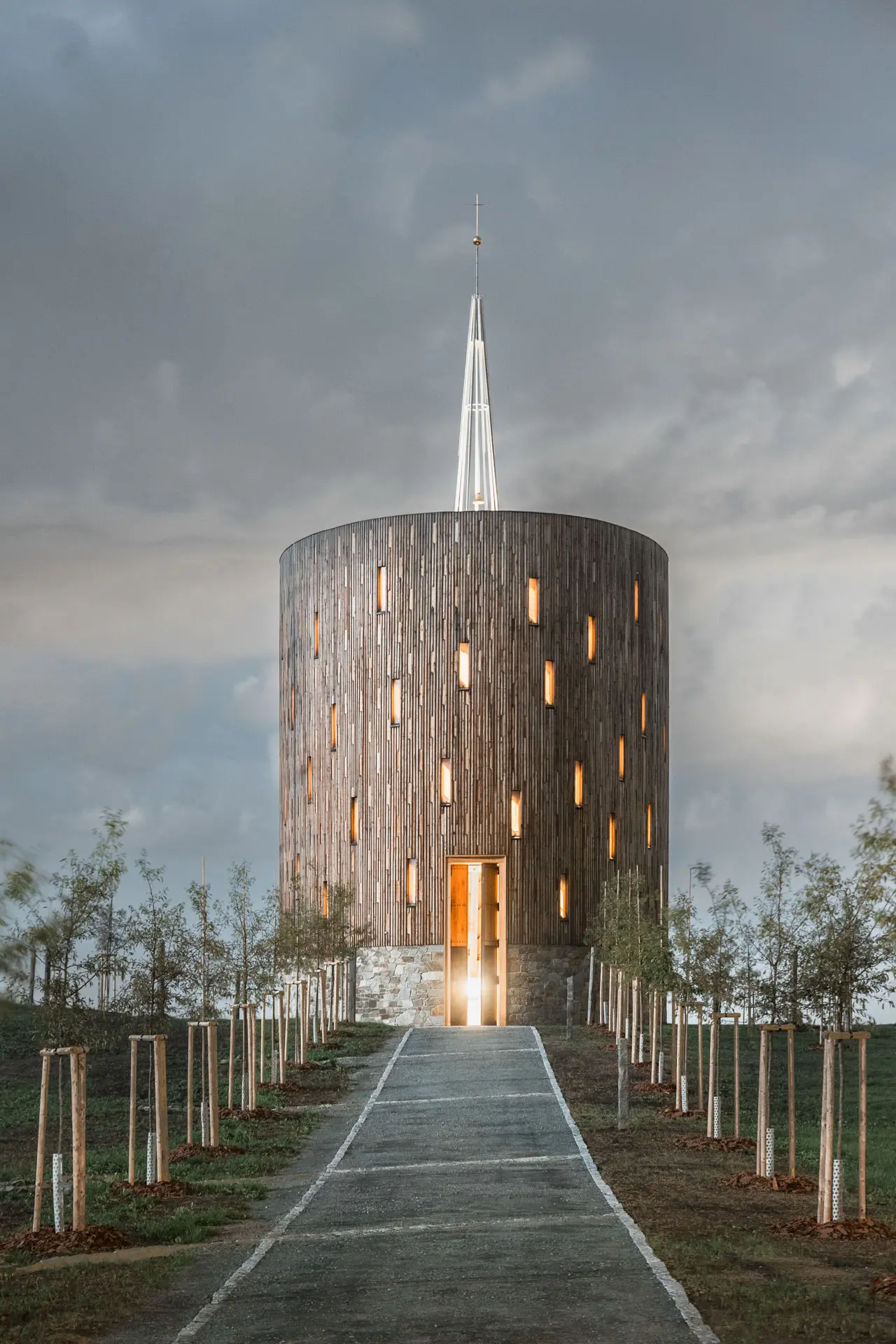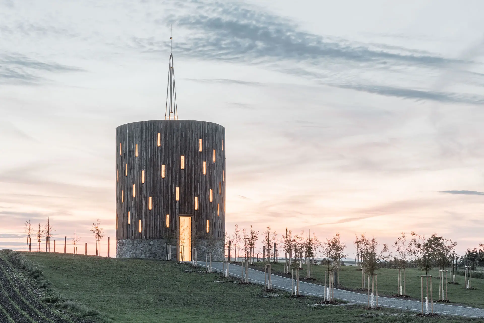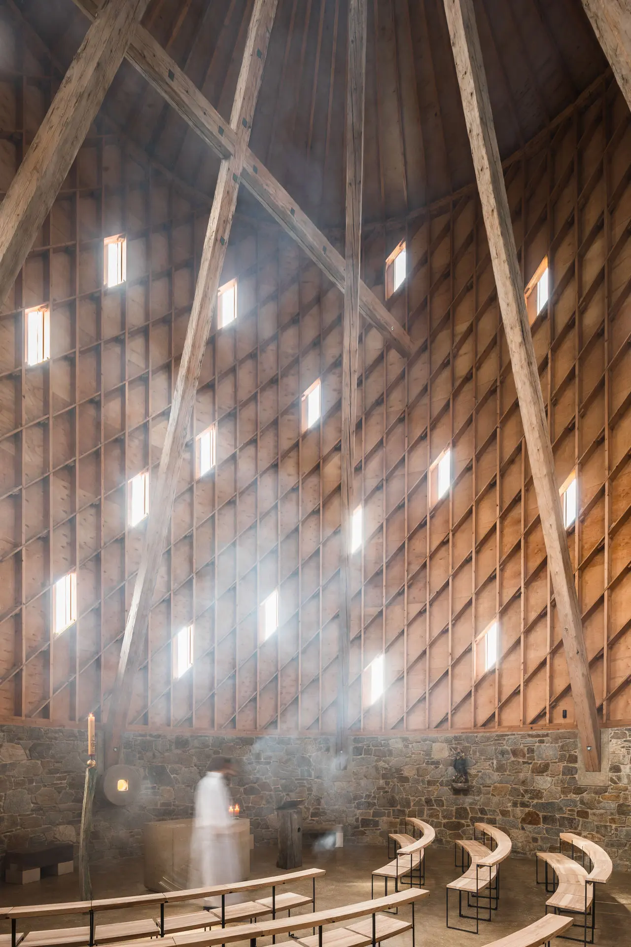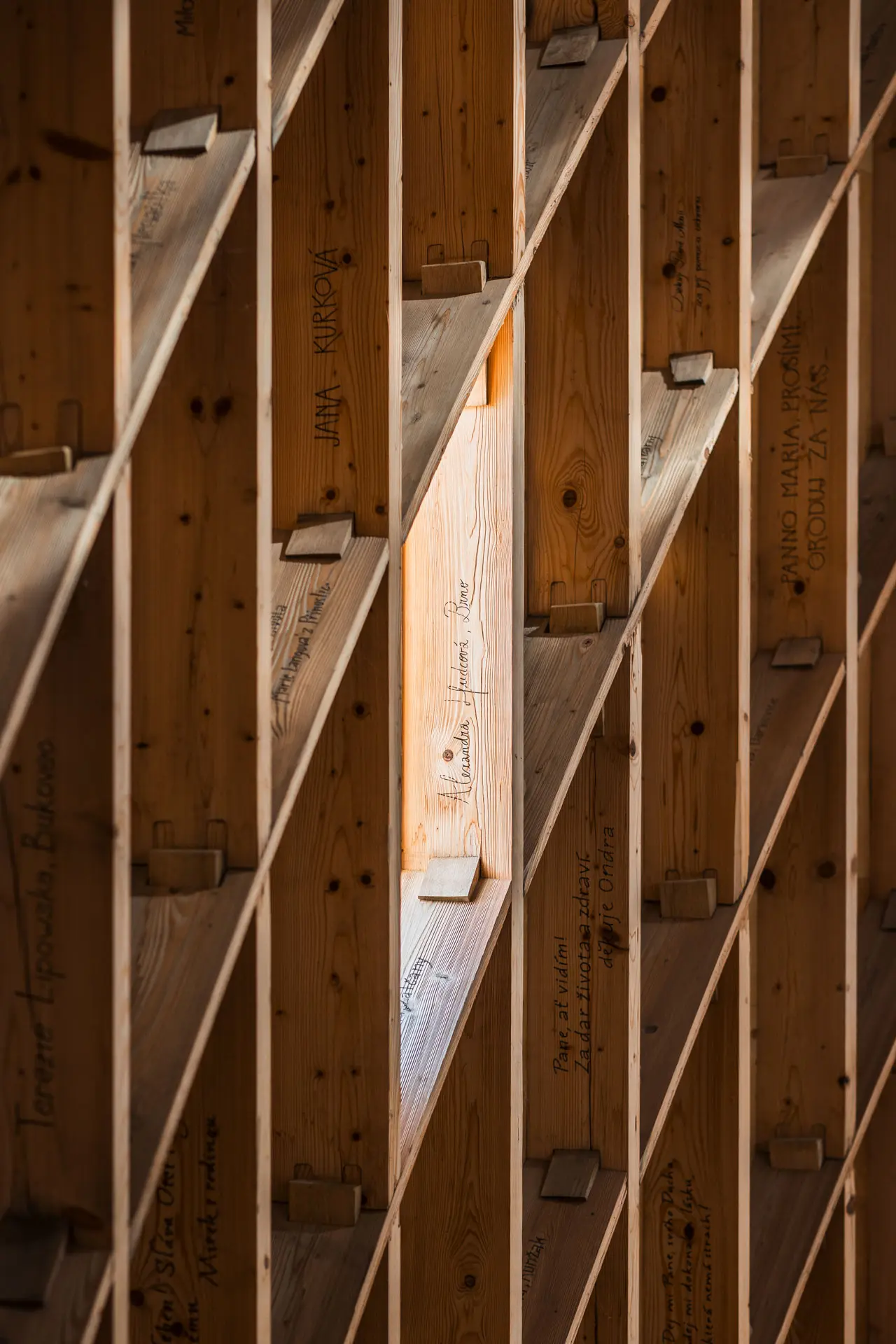 Srdcem kaple je unikátní lamelová konstrukce, která propouští denní světlo a vytváří v interiéru proměnlivou hru stínů. Každá lamela byla v našich dílnách opracována, kartáčována pro zvýraznění přirozené textury a opatřena čepovými spoji. Výsledkem je lehká konstrukce, která v sobě snoubí statickou pevnost s vizuální křehkostí.