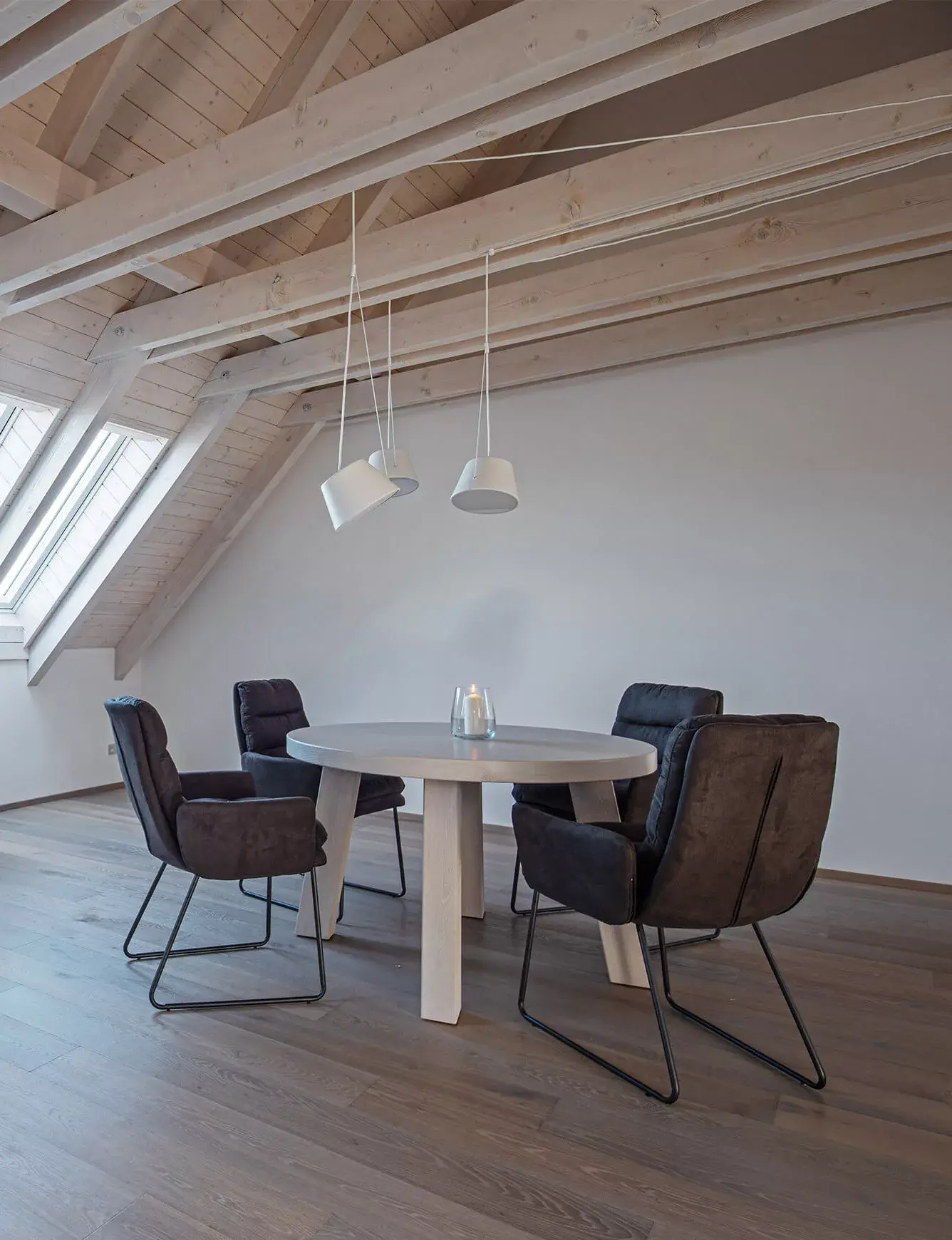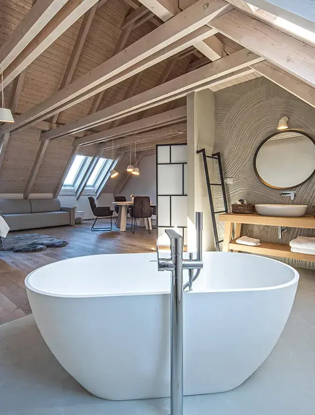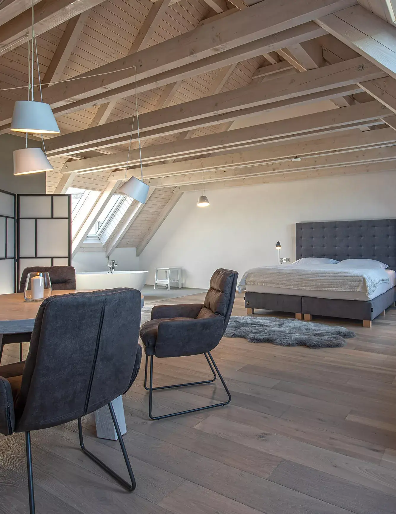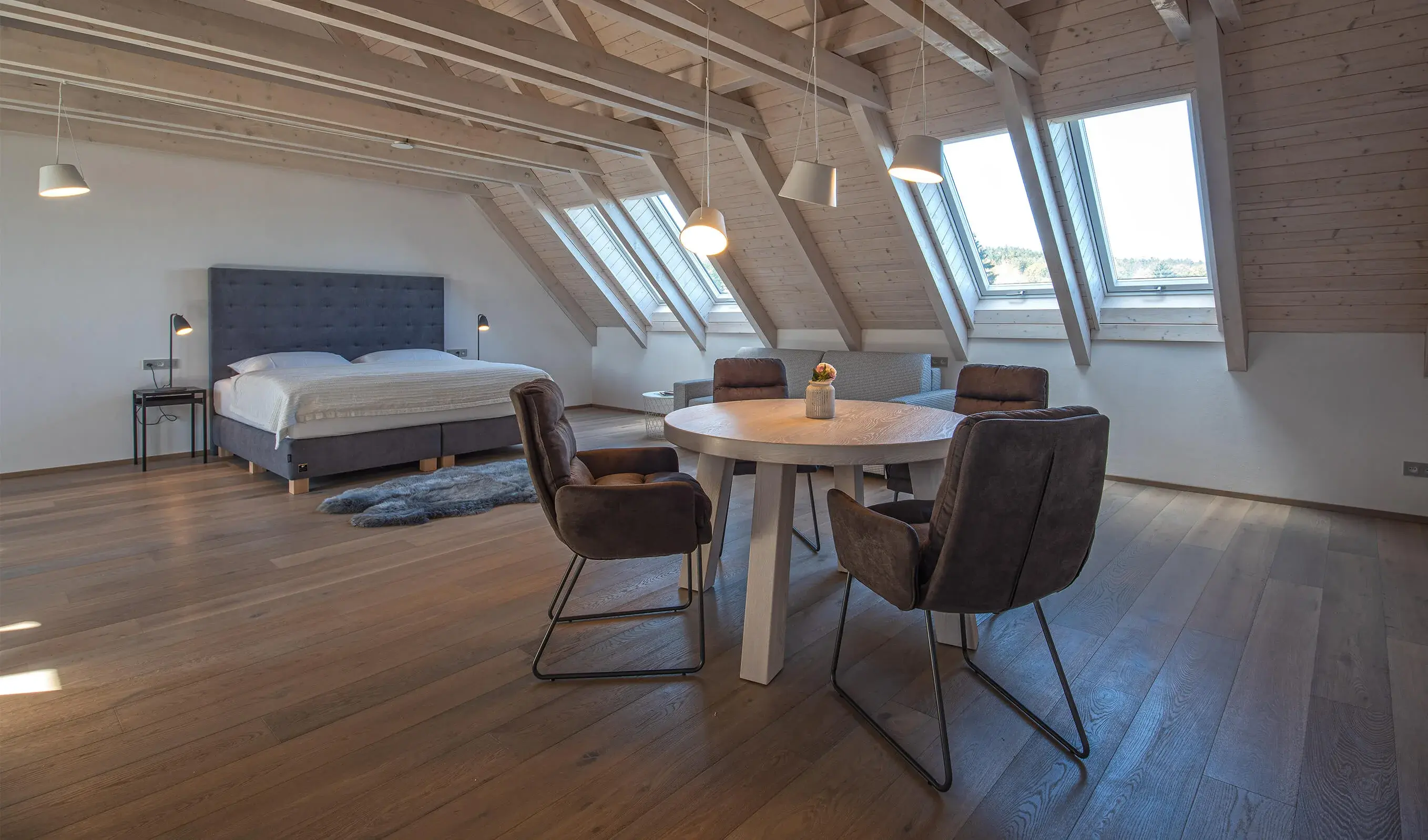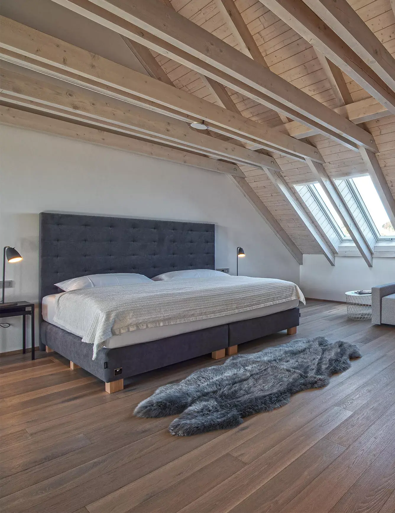 Ekspresja kolorystyczna drewnianej podłogi jest przyjemnie neutralna i kojąca, a cała przestrzeń wprost zachęca do relaksu.