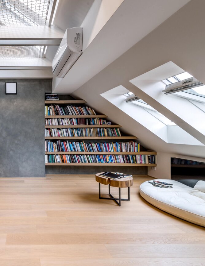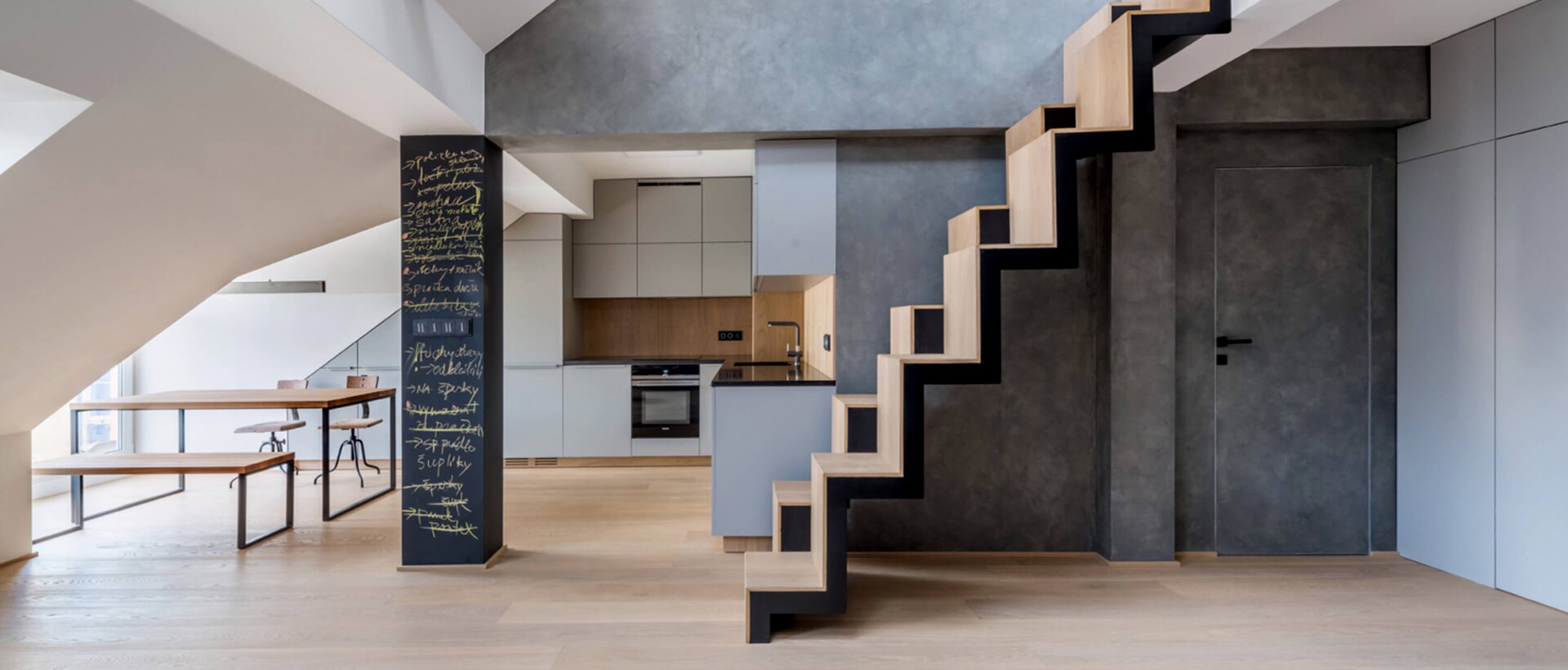 The staircase in the kitchen, which was a source of irritation to the owner, was replaced by a miller's staircase. That freed the passage to the kitchen, creating a dominant element and simultaneously a seating area.