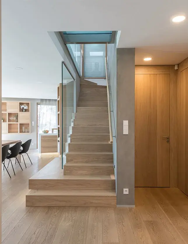 The sand-colored wooden floor harmonizes effortlessly with the interior elements in the same shade, including furniture, windows, doors, and a particularly charming staircase.