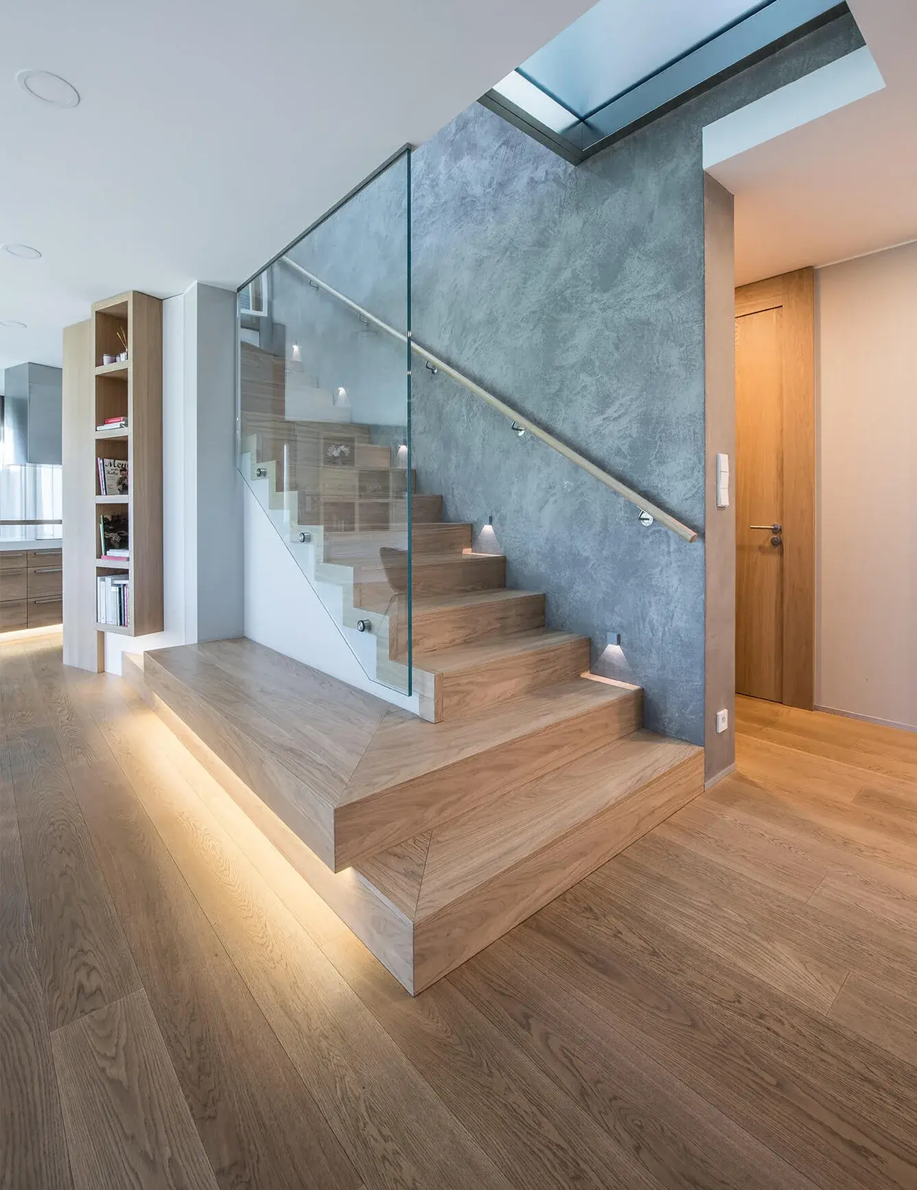 What sets Vila Hostivař apart is its captivating blend of elements. Oak wood brings a warm, natural touch that elegantly dances alongside the cool, industrial look of cement cladding, glass, and silver handrails. The result is a perfect harmony where nature and modern aesthetics seamlessly co-exist. But what really brings the atmosphere to perfection is the lighting. It adds a touch of magic and transforms every room in the villa into a realm of enchantment.