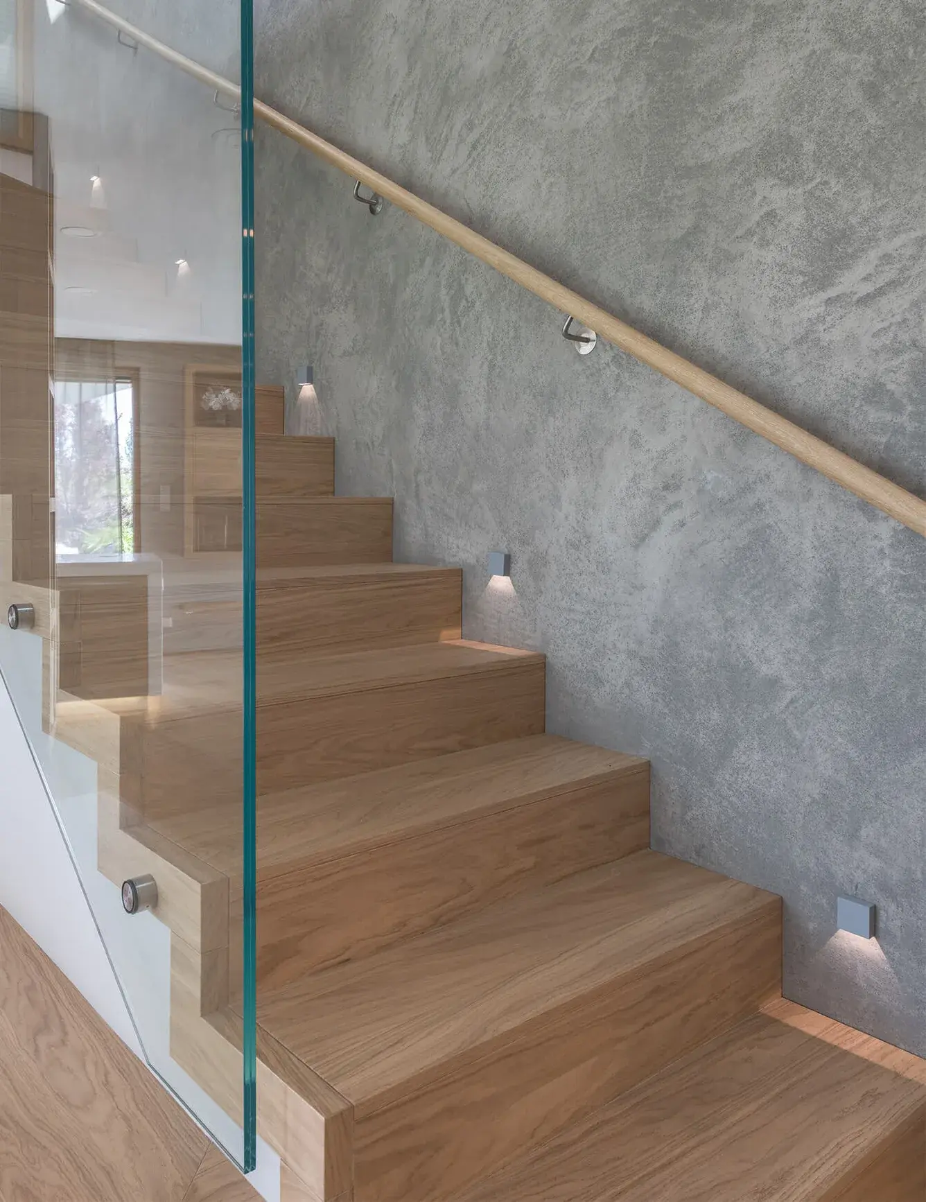 The warm wooden staircase contrasts nicely with the cool silver handrail on the cement wall cladding, giving the villa an industrial touch. The glass sidewalls on the opposite side add to the futuristic feel, making the staircase an almost avant-garde element in the villa's design.