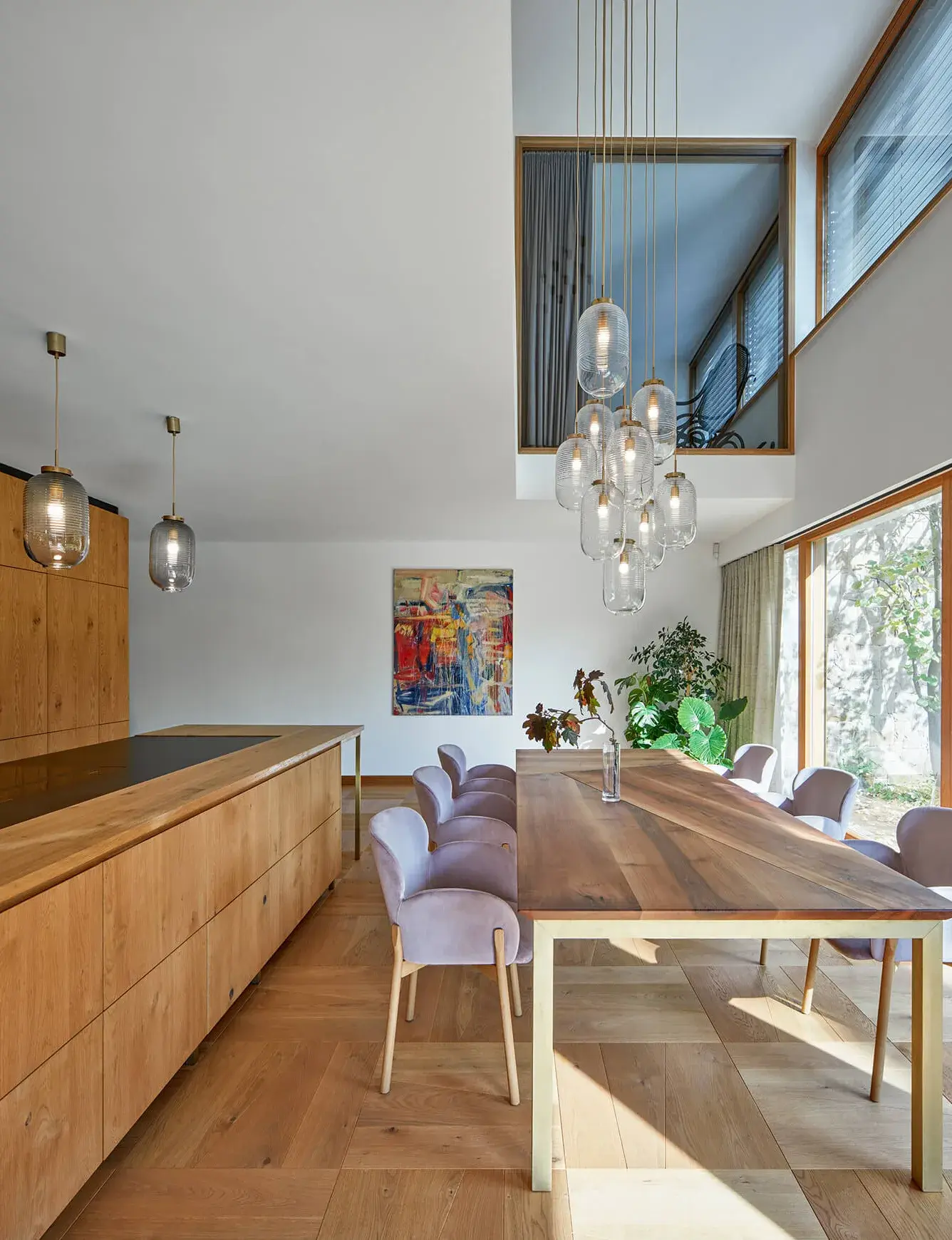 At the heart of the main living space stands a unique oak-clad cylindrical structure, seamlessly transitioning into a custom-designed OAKCENT floor. The exclusively created square parquet pattern ensures visual balance without elongating or narrowing the space.